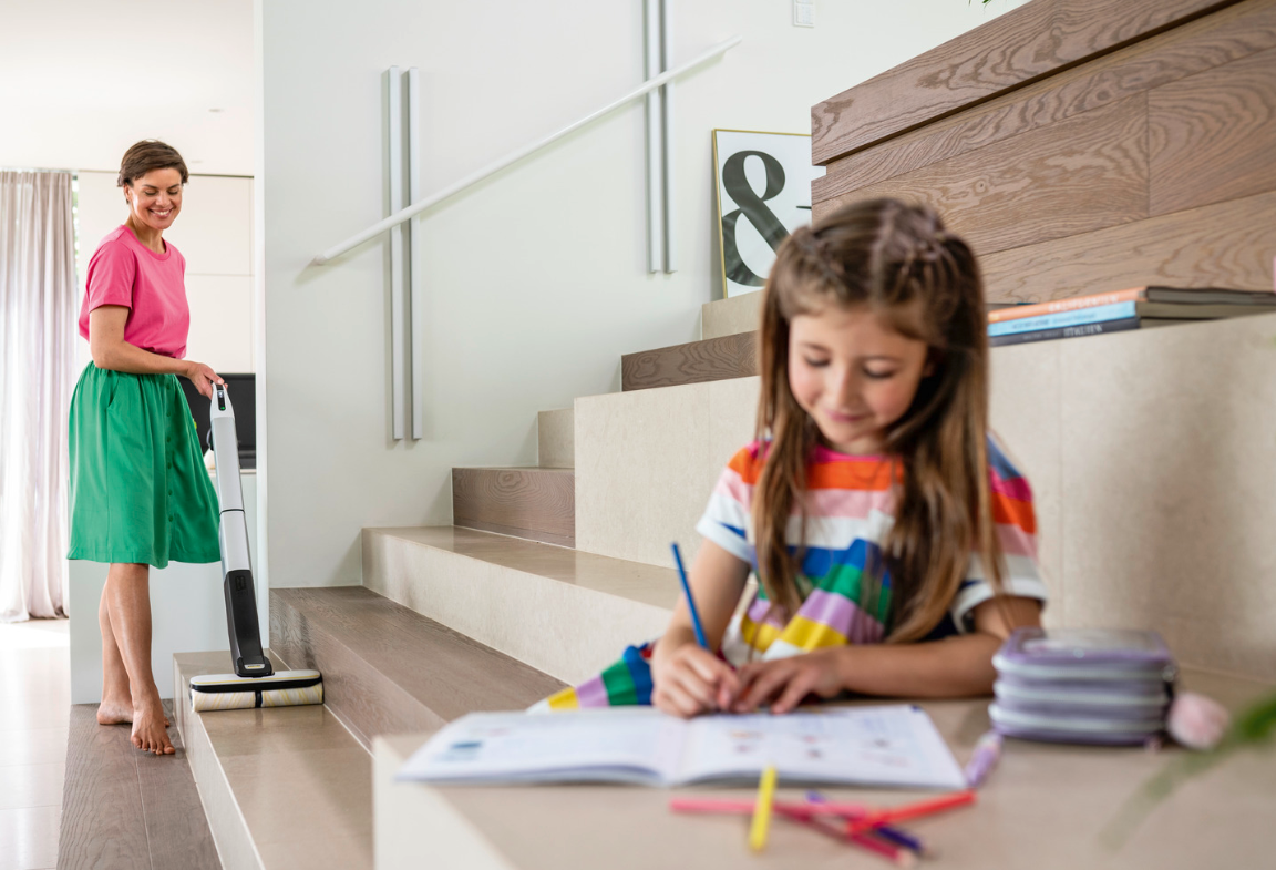 Entfernt trockenen und feuchten Alltagsschmutz in nur einem Arbeitsgang – ohne Eimer, Schrubben oder Auswringen. -