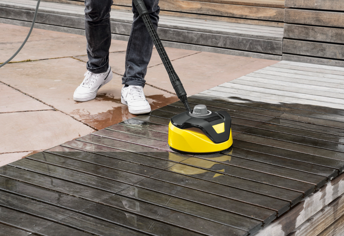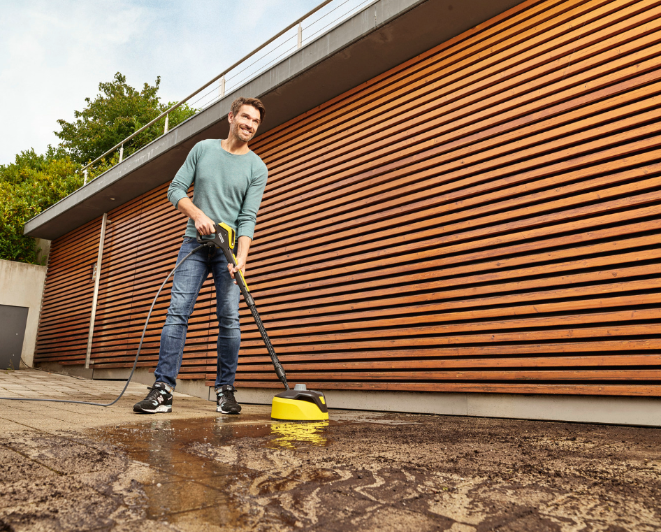 Inklusive Home Kit mit Flächenreiniger T 5 und Stein- & Fassadenreiniger 3-in-1 (1 l) für effiziente Reinigung großer Flächen wie Einfahrten, Terrassen oder Hausfassaden.