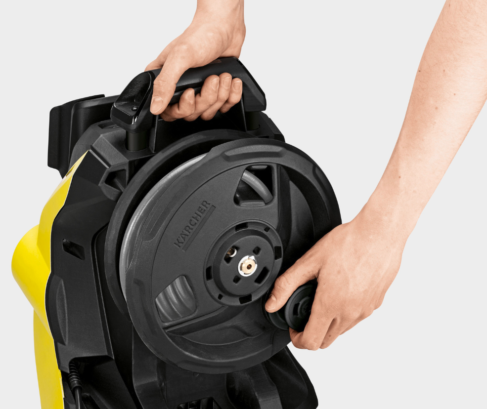 Komfortables Auf- und Abrollen des Hochdruckschlauchs – sauber verstaut und stets griffbereit. -