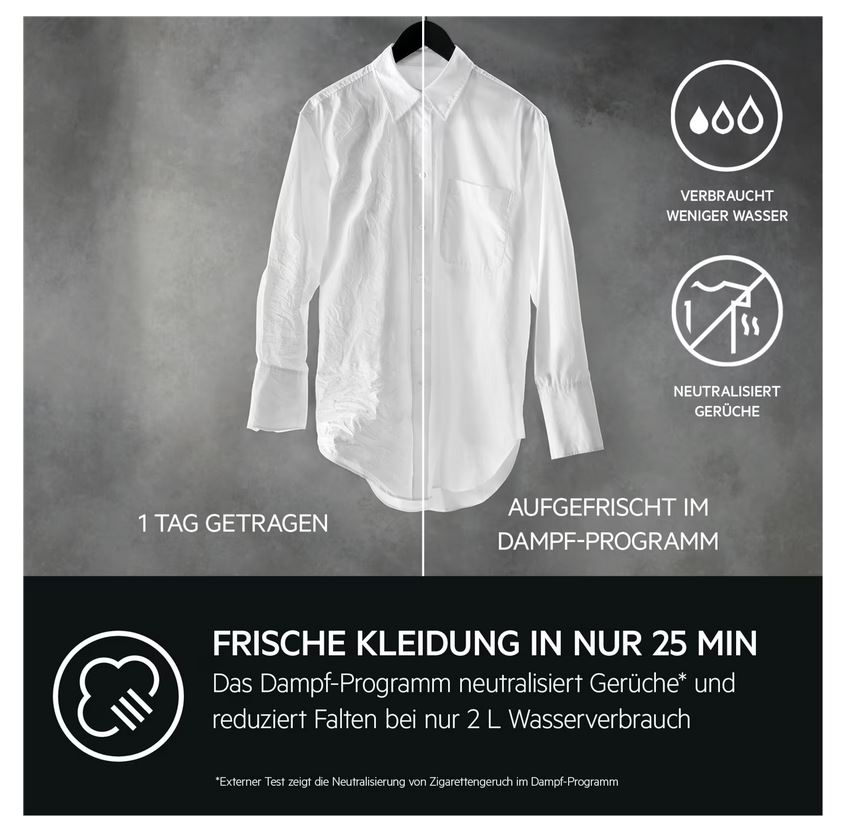- ProSteam® Dampf-Programm: Frisch gewaschene Wäsche in nur 25 Minuten mit 96 % weniger Wasserverbrauch und weniger Falten.